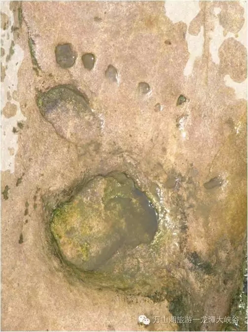 5、“山不在高,有仙則名”。這塊石頭上有幾個(gè)凹坑,就如人的腳印一般,傳說是仙人路過此地后留下的?茖W(xué)解釋該圖案是巖石在形成過程中,中間的某種特殊物質(zhì)向周圍均勻擴(kuò)散發(fā)生化學(xué)變化而形成的規(guī)則變色圖案。