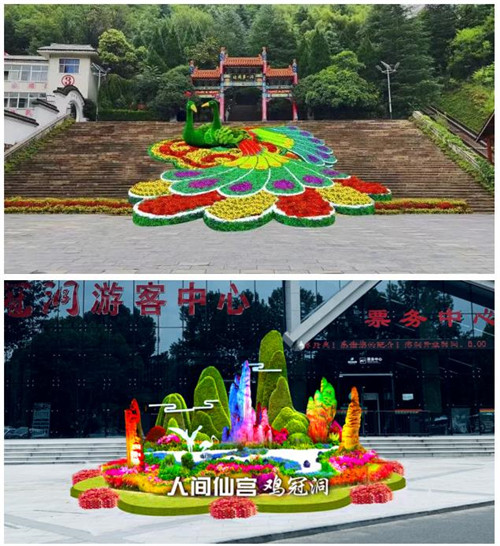 鮮花綠植遍布景區(qū),十一期間,景區(qū)“洞天福地·鸞鳥歸棲”、“億年仙宮雞冠洞”巨型主題花壇以及3000平方米的綠雕場景與游客見面,打造園林藝術新亮點,扮靚綠水青山,營造花團錦簇,喜迎國慶的熱烈氛圍!