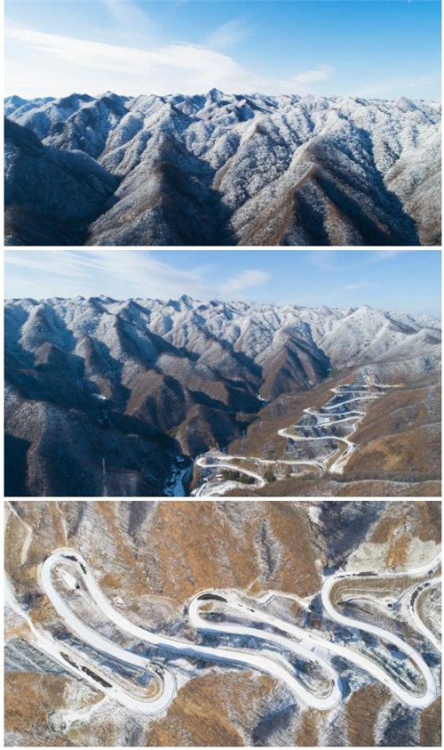 重渡溝十八盤公路,雪景有其獨特的韻味,皚皚白雪,遍布群巒,仿佛輕撫著一層白紗。