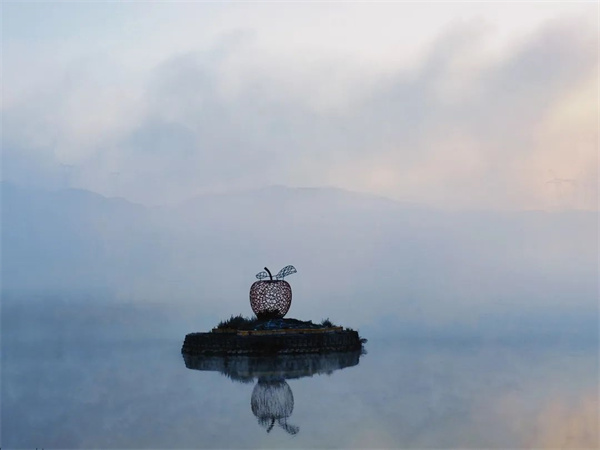 輕且薄的云霧,似層層薄紗輕覆在水面上,如夢似幻。