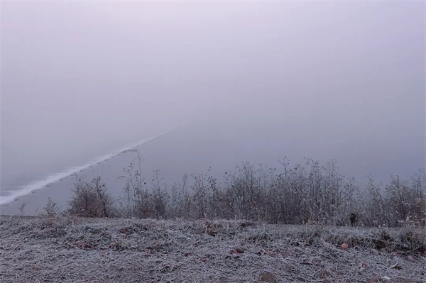 草木結(jié)霜,河面被霧氣籠罩,仿佛是神秘的仙境,給人一種虛無縹緲的感覺。