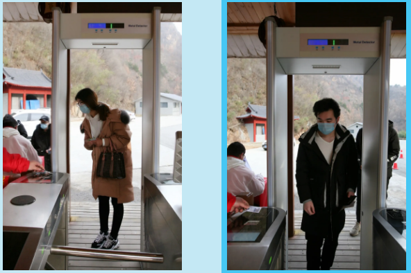 每一個通過這臺體溫檢測安檢門的人員,他們的體溫都會在安檢門上方電子屏幕中顯示,該體溫安檢門采用紅外感應測量經(jīng)過人員的手臂或額頭體溫,一旦超過37度,指示燈便會由綠色變?yōu)榧t色,以提醒工作人員注意。整個過程減少了人員接觸,更加方便快捷、安全有效,確保了景區(qū)旅游安全環(huán)境。