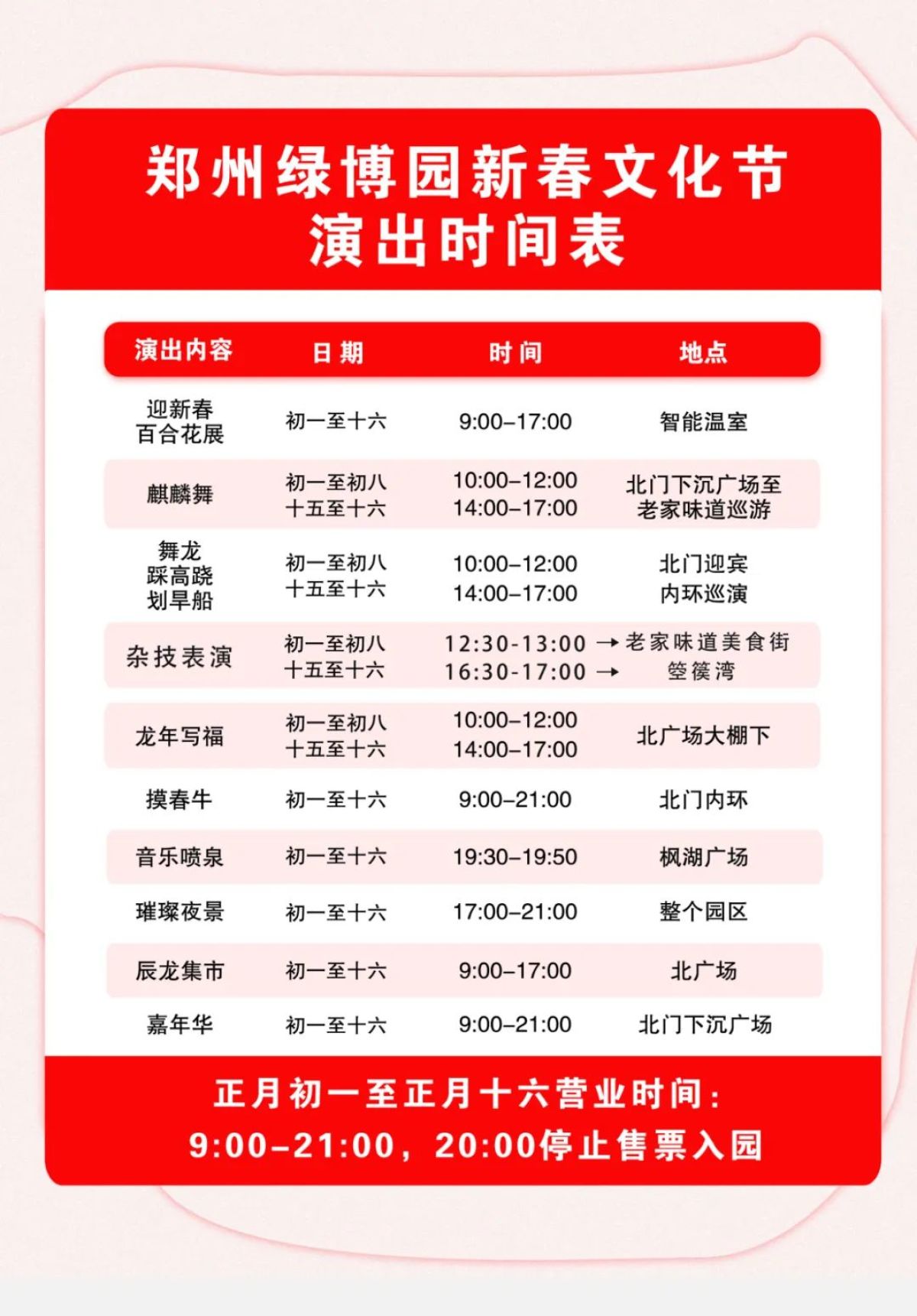 假期有期,歡樂(lè)無(wú)期,鄭州綠博園內(nèi)精彩仍在繼續(xù),百合花展、音樂(lè)噴泉、璀璨夜景將不間斷持續(xù)到正月十六,民俗社火表演初九至十四暫停表演,正月十五、十六回歸上演。