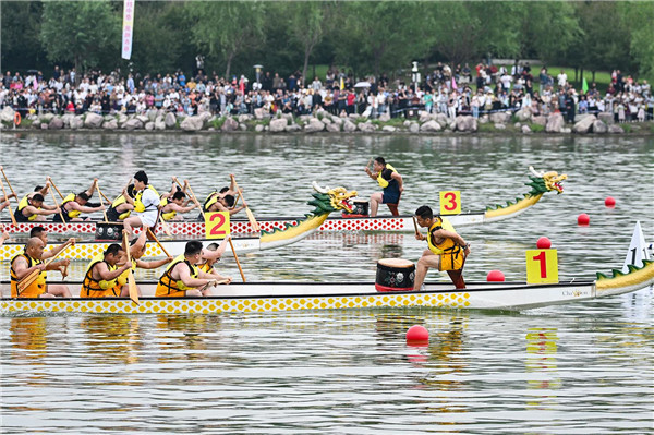 “沖啊!”“加油!”伴隨著岸上陣陣吶喊,發(fā)令聲響,鼓點(diǎn)齊作。4只龍舟如離弦之箭,在鳳湖水上賽道劈波斬浪、飛馳競(jìng)渡。在鼓手規(guī)律有力的節(jié)奏聲中,選手們喊著號(hào)子、揮動(dòng)船槳,鉚足勁,齊心協(xié)力劃動(dòng)船槳、沖向終點(diǎn)。