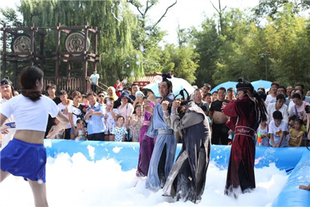 一年一度的“潑水大亂斗”全新升級(jí),李逵、宋江、武松諸多江湖好漢“穿越而來”帶你一起玩濕身!在水花與音樂的催化下,一起縱情一“夏”,拿起水盆逢人就潑,上千把水槍瘋狂掃射,就是這么的“喪心病狂”,動(dòng)感街舞、傣族舞蹈、互動(dòng)竹竿舞等多場(chǎng)主題演藝秀現(xiàn)場(chǎng)熱辣助興,享受夏日的無限激情與狂歡,讓你真正樂不思“暑”!