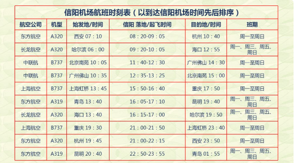 通航初期,明港機(jī)場(chǎng)將開通北京南苑-信陽-佛山、上海虹橋-信陽-重慶、杭州-信陽-西安航線(每天一班,往返);開通青島-信陽-昆明、哈爾濱-信陽-?诤骄(每周一、三、五、七各一班,往返)。