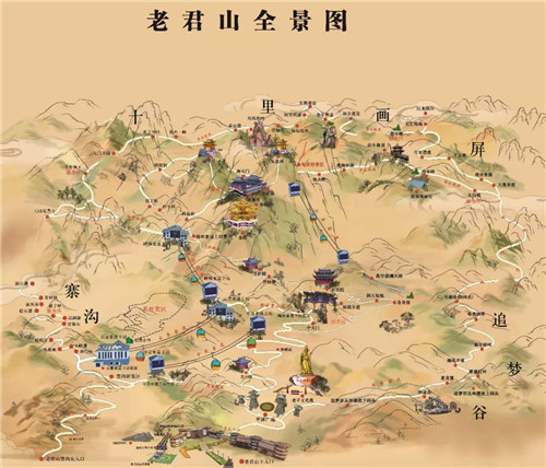 目前已形成了以老君山為主線,以寨溝、追夢谷為兩翼,以游客中心綜合服務(wù)區(qū)、老子文化苑體驗區(qū)、金頂?shù)烙^祭拜朝圣區(qū)、十里畫屏精品游覽區(qū)、舍身崖自然觀賞區(qū)、追夢谷原始生態(tài)探險區(qū)、寨溝養(yǎng)生休閑度假區(qū)共七大游覽區(qū)。