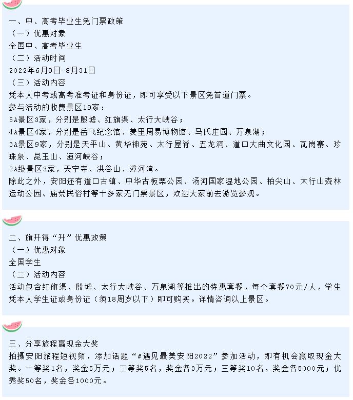 為迎接黨的二十大勝利召開(kāi),助力“行走河南·讀懂中國(guó)”品牌體系建設(shè),向年輕人講好中國(guó)故事,安陽(yáng)市舉辦“全國(guó)學(xué)子游安陽(yáng)”2022快手網(wǎng)紅文旅大會(huì)暨遇見(jiàn)最美安陽(yáng)短視頻大賽活動(dòng)。為讓廣大學(xué)子暢享古都之旅,在畢業(yè)季到來(lái)之際,安陽(yáng)針對(duì)全國(guó)中、高考畢業(yè)生推出系列優(yōu)惠政策,內(nèi)容如下: