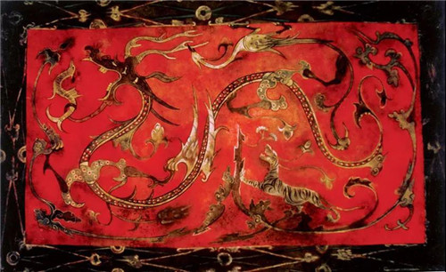 青龍?jiān)谔,巧足生花;攀龍朱雀,銜角飄飛;仰首白虎,攀龍附鳳;俏皮玄武,龍舌環(huán)抱。