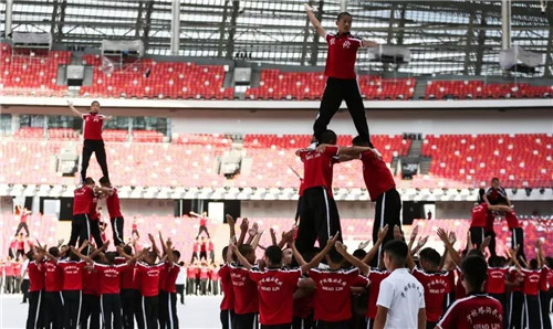 期間,為了達(dá)到更好地藝術(shù)效果,十八般兵器和人塔的演練不斷地變換動(dòng)作和組隊(duì)造型,學(xué)員們就一遍遍地把更改后的動(dòng)作現(xiàn)場(chǎng)示范給場(chǎng)上的導(dǎo)演組,直到得到導(dǎo)演組的允可才開(kāi)始有序地演練,很有一股“不達(dá)目的誓不罷休”的狠勁和韌勁兒。