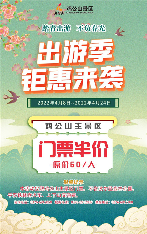春暖花開(kāi),美好春日,踏青出行,不負(fù)春光,雞公山景區(qū)出游季特惠活動(dòng)開(kāi)始啦。4月8日~4月24日,雞公山主景區(qū)門(mén)票半價(jià)啦!僅需30元/人!(本活動(dòng)僅限雞公山主景區(qū)門(mén)票,不含波爾登森林公園、平漢鐵路老火車(chē)、上下山交通費(fèi)。)就可以暢游美麗雞公山。
