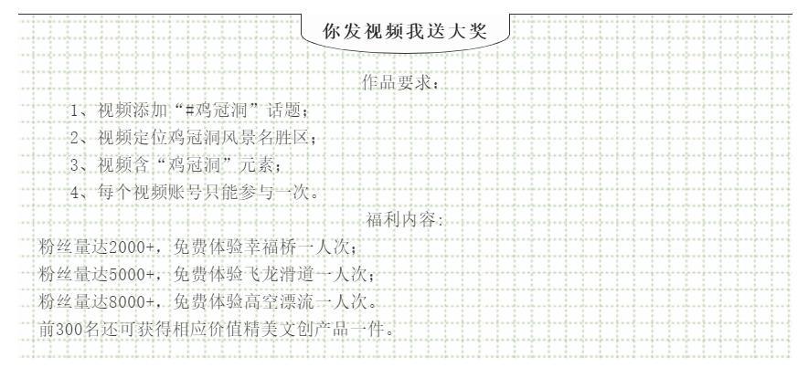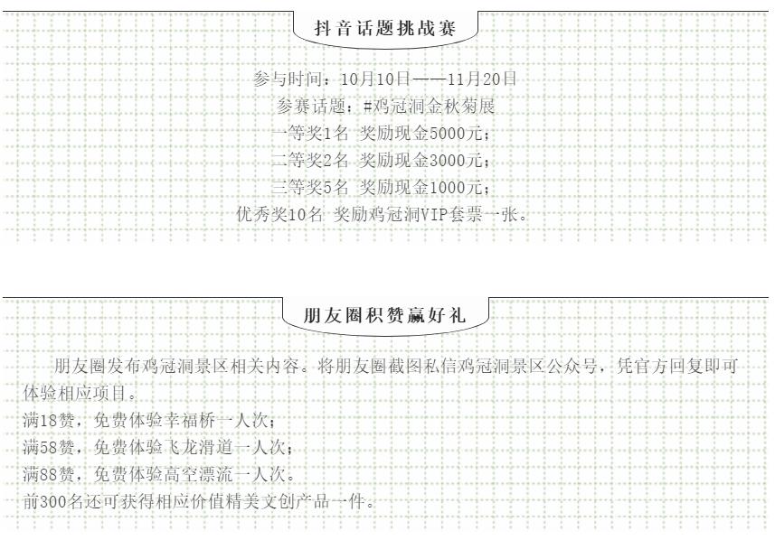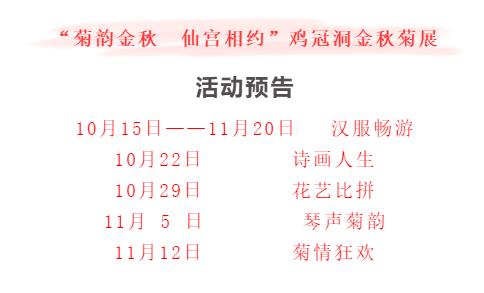 雞冠洞景區(qū)10月15日-11月20日舉行,“菊韻飄香、情滿金秋”漢服暢游活動(dòng),活動(dòng)期間,只要身穿漢服即可免費(fèi)入園,賞菊暢游。