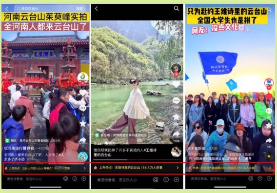 #云臺(tái)山開啟人山人海模式、#王維詩里的云臺(tái)山、#把高校大旗插滿云臺(tái)山的山頭…… 一份份排名、一次次爆火、一波波刷屏,百萬網(wǎng)友打卡,千萬網(wǎng)友熱議,持續(xù)登上抖音熱榜,一時(shí)間,云臺(tái)山成為“流量擔(dān)當(dāng)”。