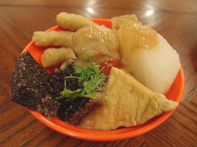 有點(diǎn)像是雜燴,里面有貢丸,蘿卜,米血糕等等,在淋上特制的醬料,好吃到爆。