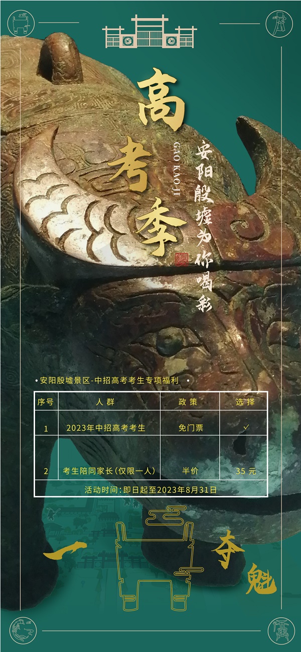 即日起至2023年8月31日,安陽殷墟景區(qū)推出中高考考生專項福利,2023年中招高考考生憑本人身份證、準考證可享受免門票政策,考生陪同家長 (僅限一人) 可享受景區(qū)門票半價 (35元)優(yōu)惠政策。