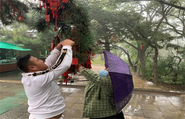 一大早,景區(qū)內(nèi)到處可見銀發(fā)老人們和子女們舉家出游的歡樂畫面。在二祖庵祈福樹前,有很多游客將許愿牌掛到祈福樹上并拍照留念,來自南陽的王先生在煉魔臺、鳳凰石等多處祈福地點和家人拍下了溫馨的全家福。王先生說,自己常年在外奔波無暇顧及家中父母,他在無意間在網(wǎng)絡(luò)上看到了少林景區(qū)重陽節(jié)登高祈福的活動,自己的父母也沒有來過少林景區(qū),并且乘坐嵩山索道可以享受半價優(yōu)惠。于是就借此機會,趁著重陽節(jié)錯峰出游帶著父母來到少林景區(qū)來看一看,也算盡一盡自己的孝道。