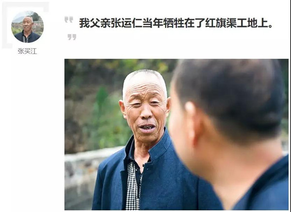 紅旗渠通水那天,張買江的母親,那個(gè)因?yàn)樗フ煞虻呐,坐在池邊,呼叫著丈夫的名字?ldquo;運(yùn)仁啊,你家大孩兒把水引過(guò)來(lái)了,你也可以放心了。”