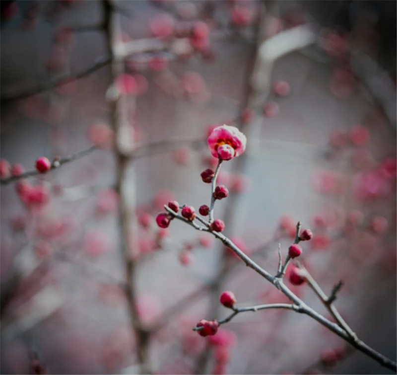 一株株梅花已含苞待放,枝頭綴滿紅艷艷的花苞,色彩濃烈,像不像一個天然的小心心,感嘆大自然的神奇之筆.