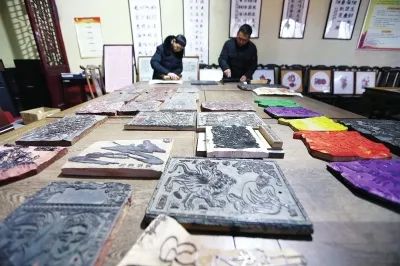 周家口木版年畫的第七代傳承人穆廣科、楊峰正在制作年畫
