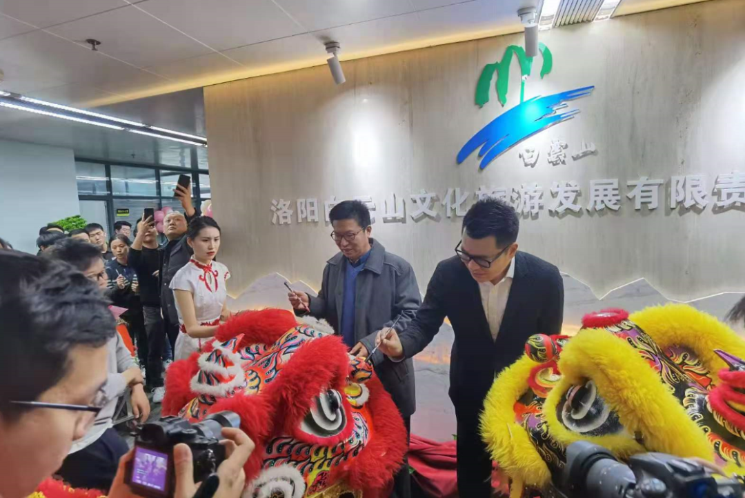 洛陽白云山文化旅游發(fā)展有限責(zé)任公司總經(jīng)理蘭海波和戰(zhàn)略發(fā)展顧問李英杰為營銷中心鄭州辦事處揭幕,醒獅點(diǎn)睛送上祥瑞祝福。