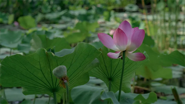 荷葉田田,荷花依依,伴著鳥語花香散步聊天,感受撲面而來的浪漫氣息;或坐在長椅上看云卷荷舒,享受愜意的賞花光景。