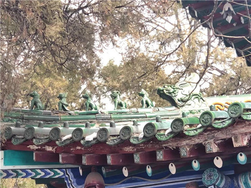 龍子螭吻,為“龍生九子”中的老二,傳說是龍頭魚身,口潤嗓粗,平生好吞,即殿脊的獸頭之形,遂成殿脊兩端的吞脊獸,取其滅火消災。這個裝飾現(xiàn)在一直沿用下來,在古建中,“五脊六獸”只有官家才能擁有。泥土燒制而成的小獸,被請到皇宮、廟宇和達官貴族的屋頂上,俯視人間,真有點“平步青云”和“一人得道,雞犬升天”的意味。少林寺里的各殿堂屋檐上,如大雄寶殿、藏經(jīng)閣、觀音殿、普賢殿、緊那羅王殿等,均裝飾有“螭吻”龍獸,顯得莊嚴美觀。這些外形精美的小獸端坐檐角,為古建筑增添了美感,使古建筑更加雄偉壯觀,充滿藝術(shù)色彩。