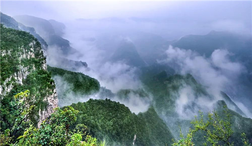 細(xì)雨在如鏡的水面上泛起了一陣陣漣漪。連綿的雨絲如簾子般將整個(gè)峽谷遮蔽,在空中織起了一片片羅幕。
