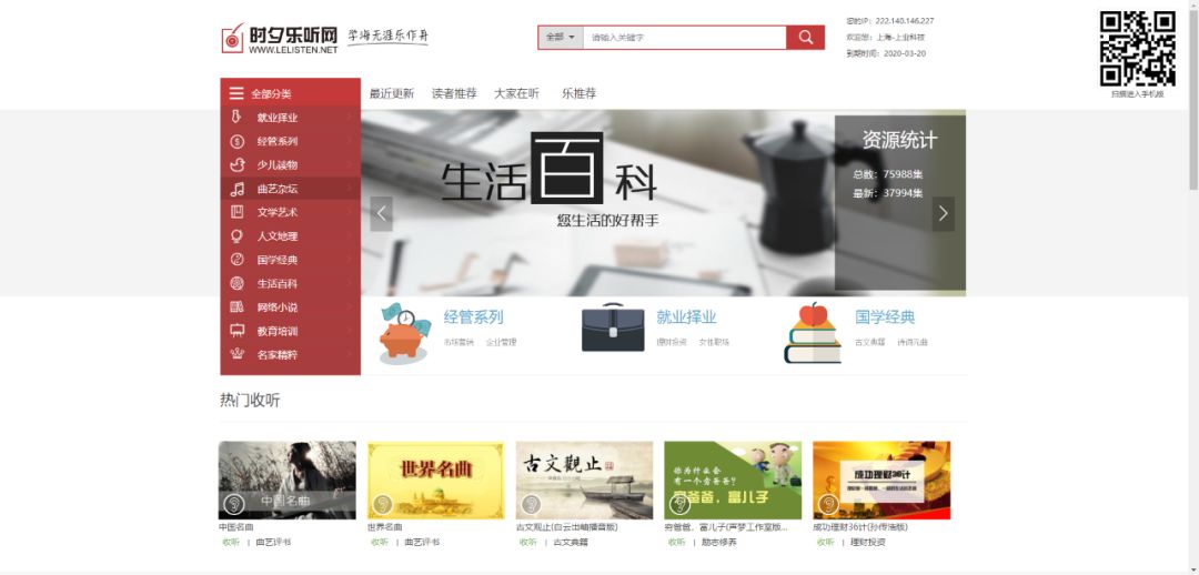 一套個性化、技術(shù)先進的網(wǎng)絡(luò)服務(wù)平臺,整合了大量經(jīng)典、流行的有聲讀物,就業(yè)擇業(yè)、經(jīng)管、少兒讀物、曲藝雜壇、文學(xué)藝術(shù)、人文地理、國學(xué)經(jīng)典、生活百科、網(wǎng)絡(luò)小說、教育培訓(xùn)、名家精粹等11個系列,全方位、廣覆蓋的有聲讀物平臺,全庫總共約一萬多課時,總量約0.5TB。