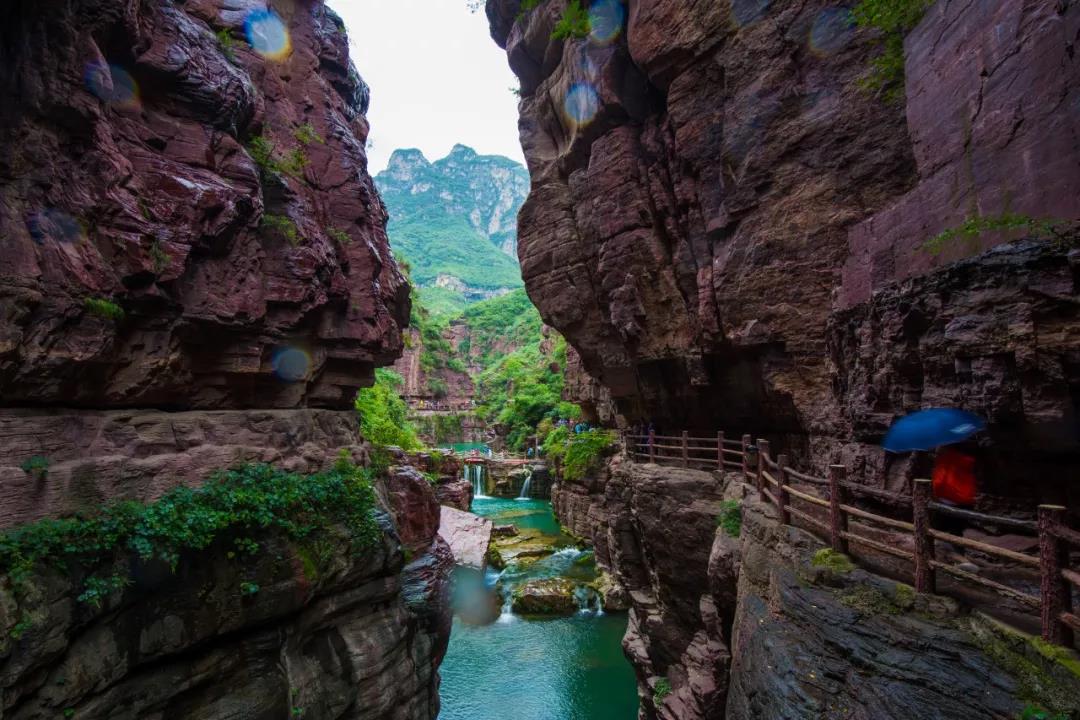 紅石峽融眾多佳景于一體,懸崖陡峭,紅巖絕壁,兼容北雄南秀之美!丹崖碧水、奇峰幽谷和數(shù)不清的潭溪泉瀑交相輝映,好似縮小了的山水世界,是不可復(fù)制的“盆景式”峽谷中的精靈。