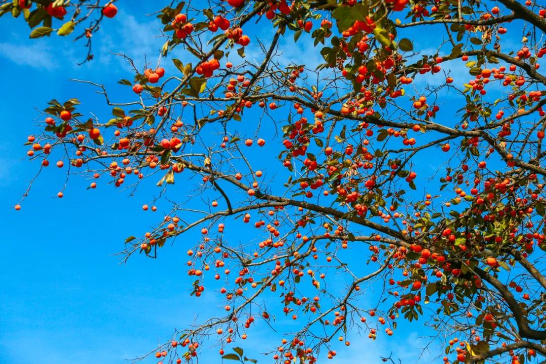 滿樹秋果的橙黃、紅艷,散發(fā)著甜蜜的氣息,楓葉、黃櫨也漸漸染滿山頭,將藍(lán)天、碧蔭和山林,映襯的格外熱鬧。
