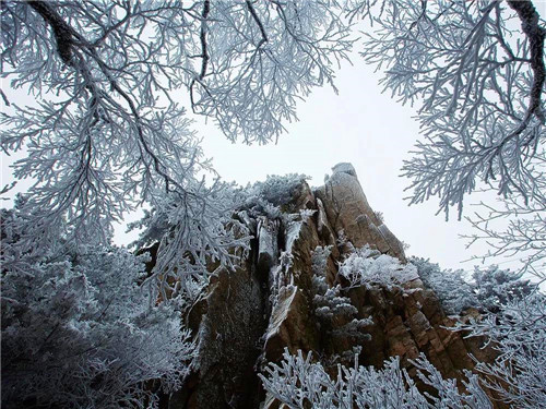 在洛陽(yáng)白云山中,萬(wàn)千奇峰在風(fēng)雪中矗立,玉皇頂,峭壁旁,皚皚白雪點(diǎn)綴其間,仿佛給大山披上了一件冰雪外衣。游道上覆蓋著厚厚的積雪,猶如白色的地毯一般。漫山遍野皆是玉樹(shù)瓊枝,樹(shù)木、果實(shí)、樹(shù)葉上凝凍著厚厚的冰層,仿佛穿上了一件件冰晶鎧甲。