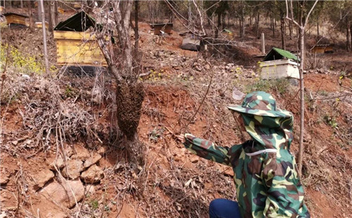 在老薛的蜂場(chǎng),我們意外目睹了難得的蜜蜂分巢全過(guò)程,前后幾分鐘時(shí)間,在蜂王的帶領(lǐng)下,一個(gè)蜂箱內(nèi)的部分中蜂跟隨蜂王落在附近的樹(shù)上。薛嬸兒拿一把竹濾刷上蜂蜜把所有落在樹(shù)上的蜜蜂收回到新的蜂箱里。