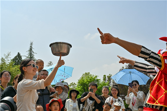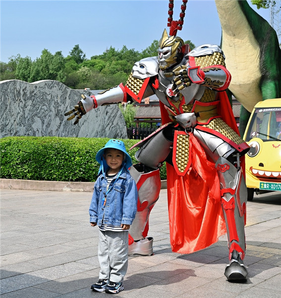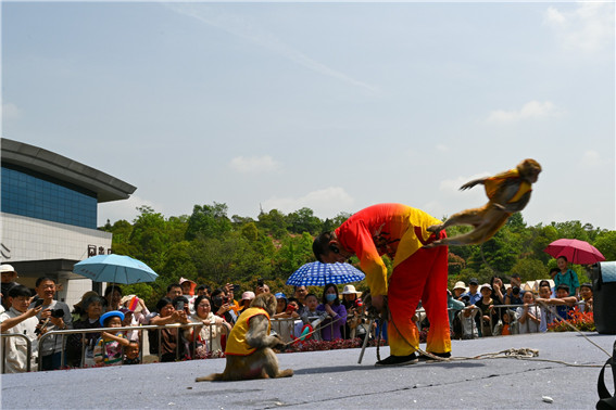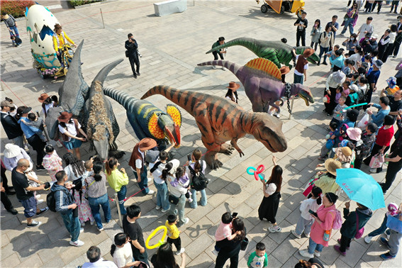 4月25日,河南省南陽市西峽縣恐龍遺跡園景區(qū)內(nèi)游人如織,恐龍迎賓、魔術(shù)、雜技表演、水上獨(dú)竹漂、猴戲等各種活動精彩紛呈,游客參與其中,文化旅游顯示出獨(dú)有的活力。