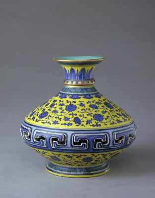 瓶撇口,短頸,扁圓腹,圈足外撇。內壁施松石綠釉。外壁通體以黃地青花裝飾?谘叵吕L卷草紋,頸部繪仰蕉葉紋及圓點紋,肩部繪回紋及如意云頭紋。腹部上、下繪纏枝蓮紋,中部為鏤空仰覆勾蓮“T”字形紋。瓶內套一小瓶,與外瓶口部相連,可以轉動。小瓶以紫紅彩為地,上繪梅樹一株。圈足內施松石綠釉,署青花篆書“大清乾隆年制”三行六字款。
