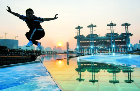 11月7日,一名少林塔溝武校學(xué)員在亞運(yùn)會開幕式表演場區(qū)附近演練少林輕功(如圖)。據(jù)了解,開幕式表演上將有來自塔溝武校的1640名少林小子上演壓軸節(jié)目——《白云之帆》,他們將在78米高空上演空中飛人,表演多個高難度動作,場面震撼。整個節(jié)目時間大概8分鐘,將是亞運(yùn)會開幕式上持續(xù)時間最長的節(jié)目。