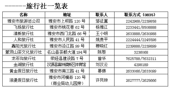 雅安市旅游局: 2223073 蒙頂山AAAA級(jí)旅游景區(qū):3232089
