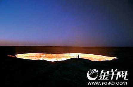 1971年,地質學家發(fā)現(xiàn)該區(qū)域蘊藏著大量的地下天然氣,在常年的開采過程中,由于不慎出現(xiàn)鉆探環(huán)狀坍塌,從而形成了一個非常大的坑洞。為了防止有毒氣體溢出,土庫曼斯坦政府允許對坑洞中的天然氣進行燃燒,這個坑洞從白天到晚上一直處于熊熊烈火燃燒狀態(tài)。因此,這處燃燒的天然氣坑洞也被人們稱為“地獄之門”。