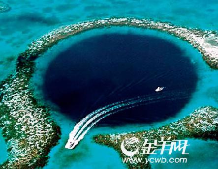 洪都拉斯伯利茲市附近海域有一處叫做“藍(lán)洞”的水下坑洞,這個大洞直徑為1000英尺,深400英尺。它是在冰河時代末期形成的一個石灰石坑洞。