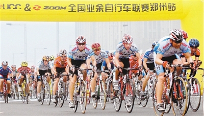昨日上午,2010年環(huán)球杯業(yè)余自行車聯(lián)賽鄭州站比賽在鄭東新區(qū)舉行,來自全省的1000多名自行車愛好者參賽,為綠色鄭州加油助威。