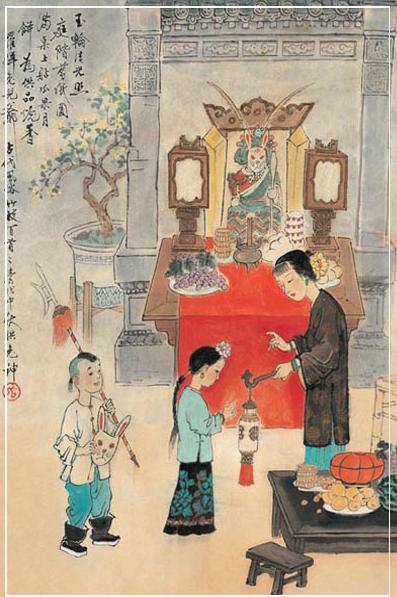 民間拜月:明清時(shí)期月神形象發(fā)生了重要變化,由早期純道教色彩的以嫦娥為主的月宮圖景演變?yōu)榉鸬澜蝗诘脑鹿馄兴_與搗藥玉兔并在的世俗形象。這個(gè)時(shí)期,人們供奉繪有月光菩薩的月光紙,也叫“月光馬兒”。富察敦崇的《燕京歲時(shí)記》(一九○六年)。記載:“月光馬者,以紙為之,上繪太陰星君,如菩薩像,下繪月宮及搗藥之兔。人立而執(zhí)杵,藻彩精致,金碧輝煌,市肆間多賣之者。長者七、八尺,短者二、三尺,頂有二旗,作紅綠,笆或黃色,向月而供之。焚香行禮,祭畢與千張、元寶等一并焚之。”