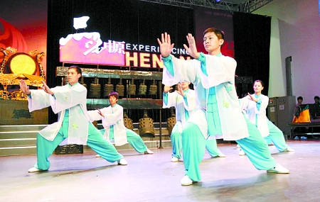 焦作太極拳表演節(jié)目由陳家溝陳氏十九世太極拳十一代傳人、中國當(dāng)代“十大武術(shù)名師”陳正雷大師及其弟子們表演陳氏太極拳套路及刀、槍、劍、棍等器械,真正體現(xiàn)出陳氏太極剛?cè)嵯酀?jì)、快慢相間、舒展大方、輕靈穩(wěn)健、松活彈抖、連綿不斷的風(fēng)格特點(diǎn)。兩位來自美國和俄羅斯的太極弟子也參與到表演之中,讓人們深切感受到太極的魅力。