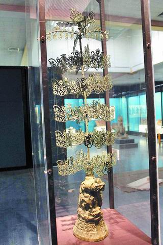 展廳中,與“搖錢樹”遙遙相對的是出土于河南濟源的“百花燈”。該燈高度超過1米,由底座、承盤、擎柄三層組成。球面底座上滿布捏塑成型的形態(tài)各異的動物,承盤上有羽人御龍飾件,擎柄中部有四枝鶴形燈盞,上部有鳳形頂燈。燈身上既有紅彩、白彩、黑彩,還有紫、紅褐、黑褐等色調(diào)。工作人員介紹說,這座燈的標準名稱叫“彩繪神獸多枝陶燈”,因其形如花枝俗稱“百花燈”。這類東西不是實用品,而是墓葬中用的,就是民間傳說中的“長明燈”吧。