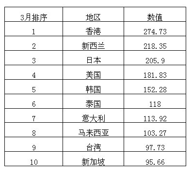 一、3月中國出境游目的地景氣指數(shù)OTI前十名目的地