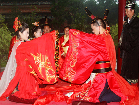 婚禮是人生最重要的禮儀之一,《禮記•婚義》:“婚禮者,將以合二姓之好,上以事宗廟,而下以繼后世也,故君子重之。”華夏民族幾千年前就有了完備的婚禮制度典禮形式,保證了立家和傳家的穩(wěn)固和久遠。漢代皇家婚禮的形式更是完美的體現(xiàn)這一形式,婚禮通過拜祖、讀《告文》、拜天地、拜高堂、夫妻對拜、行同牢禮、行合巹禮、行結(jié)發(fā)禮、受祝福等儀程,將婚禮應有內(nèi)涵演繹的淋漓盡致!