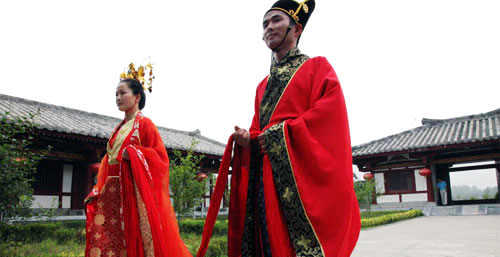 10月1日商丘芒碭山將舉行漢民族風情、喜慶莊重、別具特色的首屆“皇溝情”皇家集體漢婚禮。