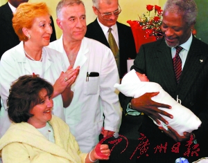 1999年10月12日凌晨0時2分,時任聯(lián)合國秘書長安南(右)看望成為地球村第60億位居民的男嬰。
