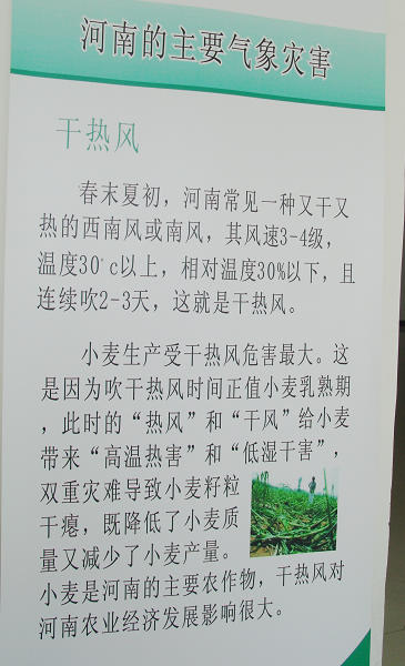 河南的主要?dú)庀鬄?zāi)害:干熱風(fēng)、干旱、洪澇、大風(fēng)、大霧、雷電、暴雨、臺(tái)風(fēng)、冰雹、沙塵暴、寒潮、暴雪。