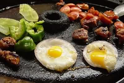 “鐵鍋蛋”是豫菜菜系很有特色的一道菜,其是用特制的鐵鍋蓋放火上燒紅。雞蛋打入碗內(nèi),攪勻,放入火腿丁、荸薺丁、蝦子和海米、味精、料酒、鹽水,鐵鍋放在小火上,將大油注入蛋漿中,并用勺慢慢攪動,防止蛋漿抓鍋。
