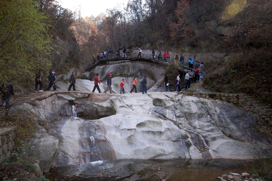 秋日的西泰山,漫山金黃,斑斕的紅葉在秋風中勁舞。大家無拘無束的在谷中漫游。潺潺流水,小橋悠悠,滿樹“笑臉”般的柿子,著實讓大家大飽眼福。靜靜地月亮灣、渺渺的圣女湖,使人在這愛情之山中陶醉,享受浪漫的回味!不愧為“天下第一情山”啊!