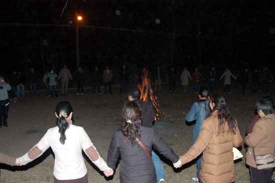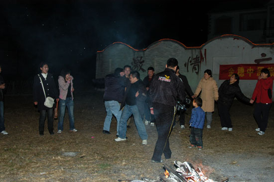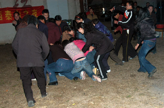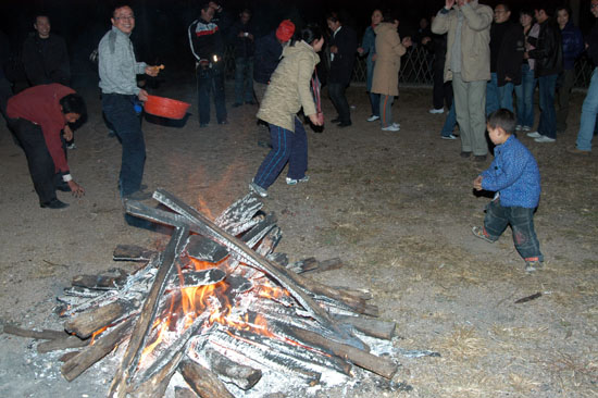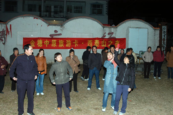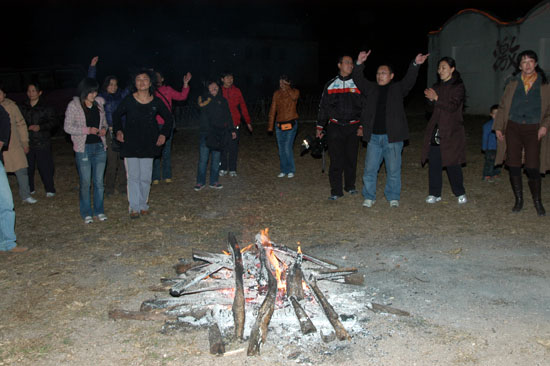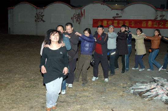 夜間的篝火晚會,看來是組織者精心準備過的,瓜子兒、花生、核桃、柿子、啤酒擺開了隨意吃喝,在極富動感的音樂中,當堆好的木柴燃燒的一瞬間,大家的激情開始澎湃、燃燒。圍繞著熊熊燃燒的篝火,燃燒去了煩惱,驅(qū)走了疲憊,在大自然中跳啊、唱!互動游戲中的歡呼聲,尖叫聲,叫好聲,帶來的是快樂,凝聚的是友情,暢想的是自由,點燃的是激情,那一夜,所有的人都瘋狂了,連西泰山也醉了!